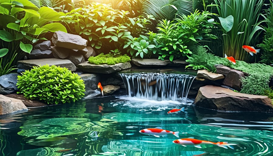 Depth variations are equally important. Create different zones within your pond: shallow margins (4-8 inches deep) for marginal plants, mid-depth areas (12-24 inches) for aquatic plants, and deeper sections (30-36 inches) for fish and temperature stability. These varying depths create natural-looking shadows and light patterns on the water’s surface.